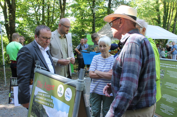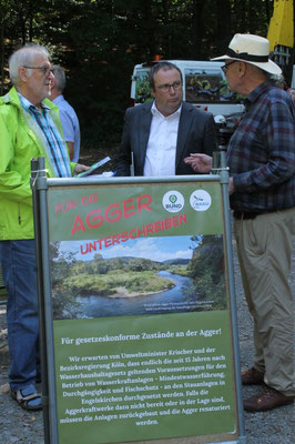 Im Gespräch am Stand von BUND und NABU wies Minister Krischer darauf hin, dass die Bezirksregierung Köln gesetzeskonforme und nachhaltige Regelungen in Abstimmung mit seinem Ministerium durchsetzen werden. Man kann also davon ausgehen, dass in absehbarer Zeit die Aggerkraftwerke Ordnungsverfügungen erreichen werden.